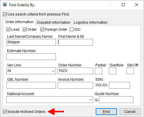 When the Include Archived Orders check box is marked on the Find it instructions the application to include all archived orders in the search results.