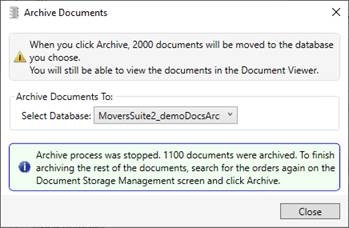 At any point during the archiving process, you can stop the process by clicking the ‘Stop’ button on the prompt. This will stop archiving the documents and will let you know of the total documents that have been archived during that time.