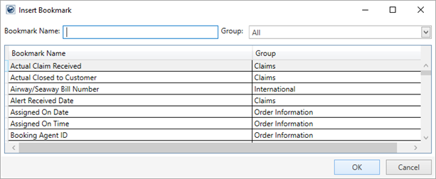 The Insert Bookmark dialog allows you to locate and insert a bookmark into a document.