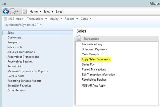 In Dynamics GP, choose Apply Sales Documents from the Sales pane