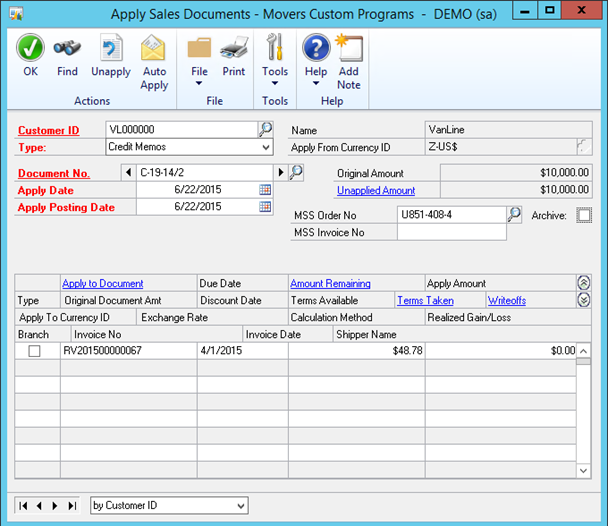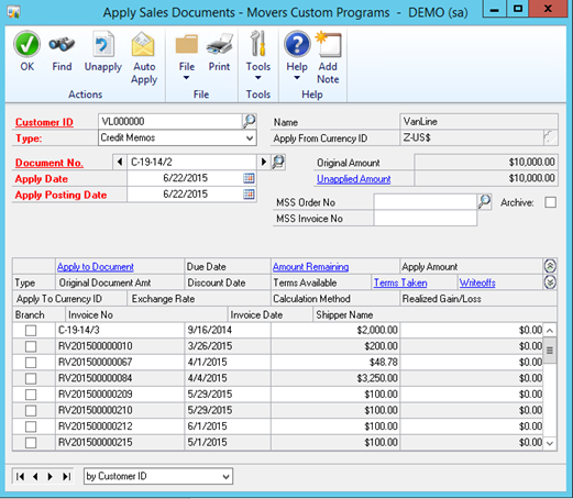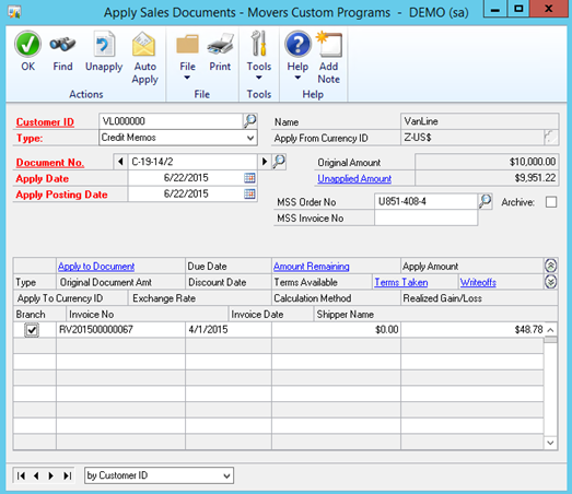 Note the Unapplied amount of the credit memo has changed to 9951.22 and the Amount Remaining on the RV2015 document has changed to 0.00
