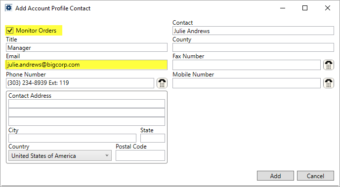 Update the supported Account Profile contacts for each record by checking the Monitor Orders flag and ensuring that the Email is valid. The Add Account Profile Contact dialog is available through the General tab within Account Profile Setup.