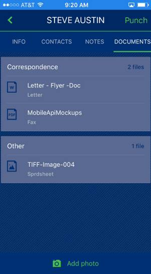 You can add a document to your device by tapping on Add photo at the bottom of the DOCUMENTS tab. Options include the ability to add a photo to the job using the camera attached to your mobile device or by choosing a photo that already exists on your device.