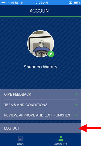 To logout of the application, open the Account screen (available from the Jobs screen) and press on LOG OUT. You will be prompted to confirm your request. Note: MSCrew does timeout after an extended period of inactivity.