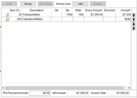 This section lists the items that can display on the invoice based on what is generated through Quotes, Rating Sends, Revenue (example below), and TechMate Imports. Additionally, when invoicing through Claims, additional sources of Receivables and Handling Revenue are also available.