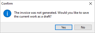 Close This function closes the screen. The user will receive a prompt requesting to save a non-generated invoice as a draft (Yes) or to discard it (No). The saved draft will be available the next time the user opens the New Complete Invoice screen for the same customer.