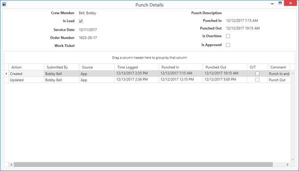 This screen is available by selecting the Punch Details option from the right-click menu on activities listed within the Mobile Crew Time data grid. It lists specific information on punch items associated to crew activity within MSCrew.