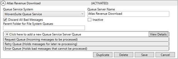Use this setup to configure queue services for processing message files through the MoversSuite Queue Service. This setup allows you to define a specific queue server referenced by the Queue Service and allows you to define the behavior of requests, retry, error, and mirror queues.