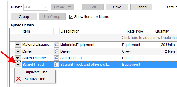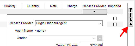 Arrow keys on the right side of the Quote tab allow you to move the selected item or group up or down in the list. The order in which the items and groups are arranged in the details section is how they appear in quote reports and when imported as revenue items in Revenue Entry.