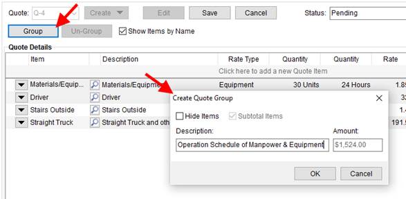 Use the Create Quote Group to combine one or more quote items into a single line item (Hide Items checked) or list all the items under a specific Description. Optionally, provide a dollar Amount when Hide Items is checked and Subtotal Items is unchecked; use this if you wish to list the items without charge and write-in your own dollar amount for the collection of items.