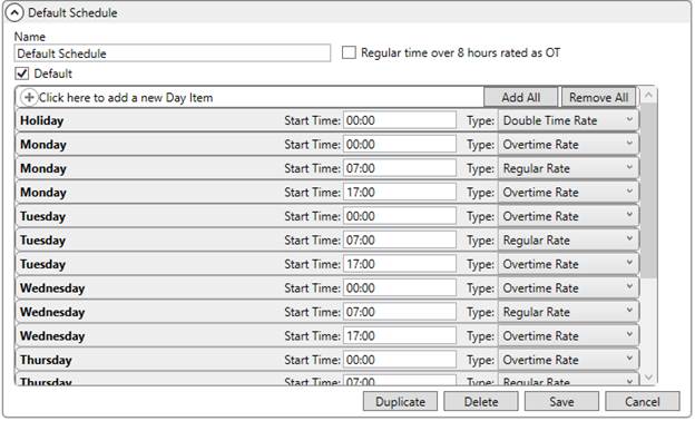 Additionally, you can instruct the application to assign a default rate based on the day of the week and the time of day through the Rate Schedule for Labor. This setup allows you to control when you wish to automatically apply overtime or double rates based on the date of service.