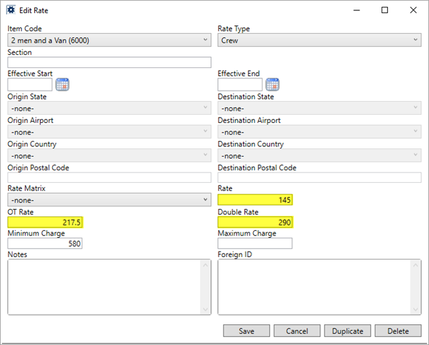 Verify that the Rate Type is assigned to rated items, along with defining the Rate, OT Rate, and Double Rate (assuming you wish to have overtime and double rates apply) within the Rate Plan through Rate Plan Setup.