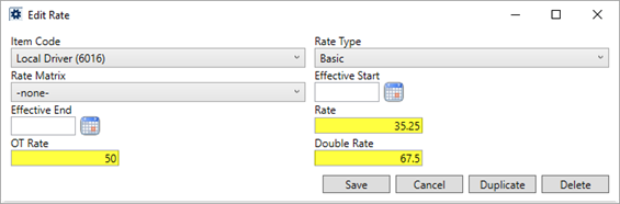 On rating for Labor Types, the application references the Rate, OT Rate, and Double Rate settings. This is based on what is established for Rate Schedule for Labor.