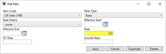Item Codes associated to a Rate Plan determine which items are rated. This includes Equipment Type, Labor Type, and Material Type items. Verify that all Item Codes for all items included in Job Costing are setup on a plan and have correct rates within Rate Plan Setup. In later steps, you will verify that Equipment Type, Labor Type, and Material Type records are assigned to the appropriate Item Code.