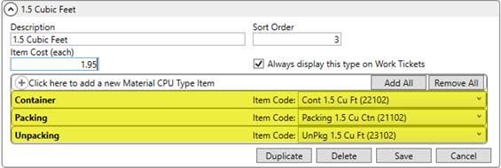 For rates established for materials, verify that the Item Code is set accordingly for each Container, Packing, and Unpacking item for each supported Material Type Setup record.