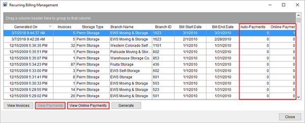 At any time, you can access the Recurring Billing Management screen and View Payments and View Online Payments, along with seeing the count of invoices associated to Electronic Payments and those that an email link was sent out for Online Payments.