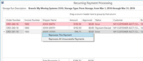 If a billing run completes and one or more payments are in error, then you have reprocessing options within the Online Payment Links Summary and Recurring Payment Processing screens as well as the option to process payments on an order-by-order basis through the following: