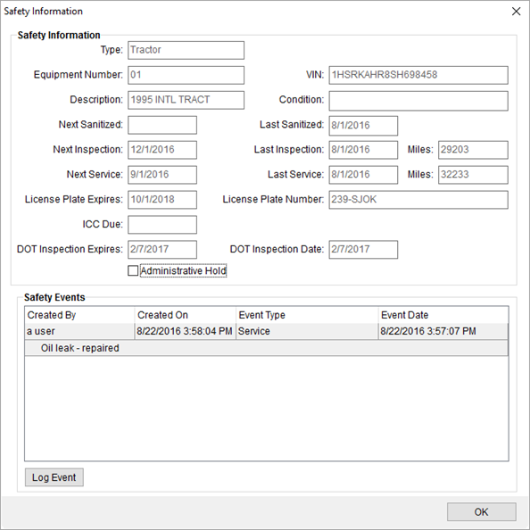 Use the Safety Information (Equipment) screen to view key safety data and log safety events for equipment records.