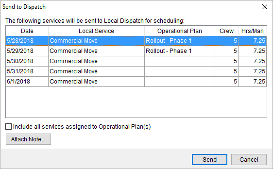 Attach Note Opens a dialog prompting you to enter a Dispatch Note to be attached to the service(s) that is available to dispatchers. There is no practical limit to the size of this note.
