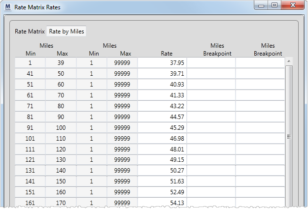 A matrix comprised of one order element such as Miles is possible by assigning “Miles” to both X Range and Y Range values. Create X Range values according to the rating scheme and set the Y Range as 1 through an unlimited value such as 999999.
