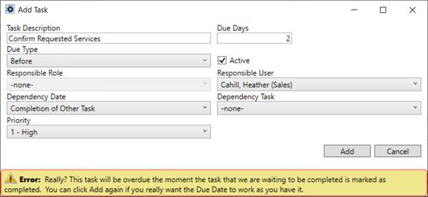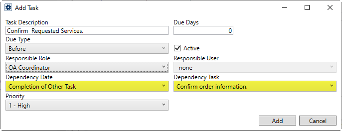 In the following example (Figure 19), the same task item from the example above (Figure 17), is now configured to add a due date based on the completion of the Confirm order information task. The Dependency Task is a different task associated to the same Tasks Setup record being updated.