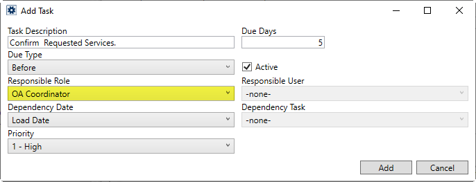 Next, build a list of Task items. These are the individual to-do items that comprise the workflow of personnel. The application computes a due date for the item as the number of Due Days before or after (based on the Due Type) of the Dependency Date. In the example below (Figure 17), a task of Confirm Requested Services shows up within the Tasks and Workflow grids with a due date that is five days before the Load Date set on the order. The task is assigned to the OA Coordinator set on the order, as well.