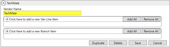 Create a single TechMate record within XML Interface Setup. Set the Vendor Name to “TechMate.”