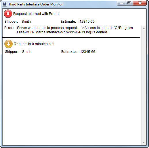 The status of the upload and downloads will appear in the Third Party Interface Order Monitor. The state and type of request display with a color-coded icon and description. Only the most recent status will appear for each request.
