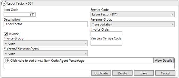 When this type is encountered, MoversSuite checks for an alternate Item Code record based on the same Service Code as the original Item Code. If one exists and the Van Line Service Code is also set to 999, then application references the alternate Item Code when items import; this alternate Item Code also available within the Transactions grid.