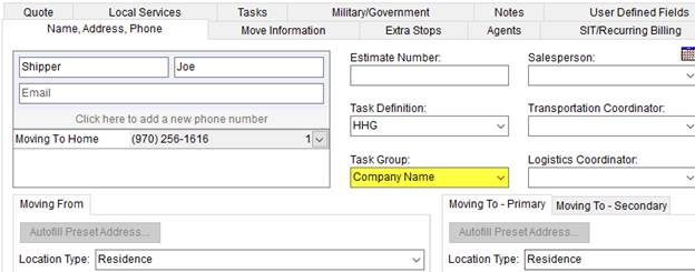 Users can select orders based on task definitions for a specific company name. Systems with defined task groups for specific companies allow you to set the company name, often referred to as “store rollouts,” as a Task Group for the order (Name, Address, Phone tab). This setting is then allows you to filter search results by the company name using the Select a Task Group field in a Find.