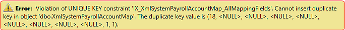 Within ADP Integration Setup, the XML System Payroll Account Map throws an error when attempting to add a duplicated XML System Payroll Account Map. This crazy error message appeared: