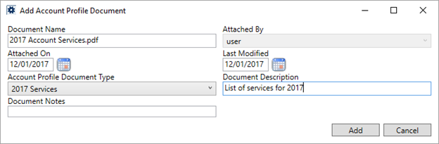 Press Add on a newly entered record to add the file as a new document on the profile or press Save to keep any changes to an existing record.