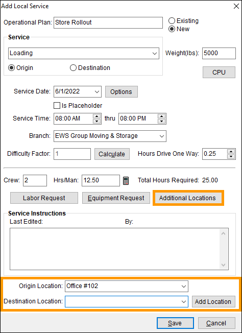 Link this service to an ending location available to the Office & Industrial order. Use the Additional Locations to specify locations in addition to this ending location on the order. The location prints on the Work Ticket Report and Work Ticket (O&I) Report. |