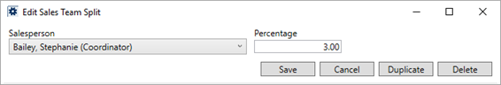 Use this screen to define a person eligible for split of the salesperson’s commission along with the percentage of the split they intend to receive. Access to this screen is through adding or editing a Sales Team Split attached to an Account Profile Setup record.