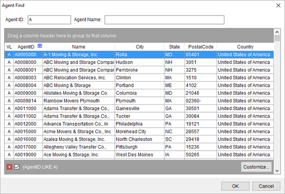 The Agent Find allows a user to quickly locate and set an agent field by Agent ID or Agent Name.  It is available through the find icon () associated to all agent fields within the following areas: