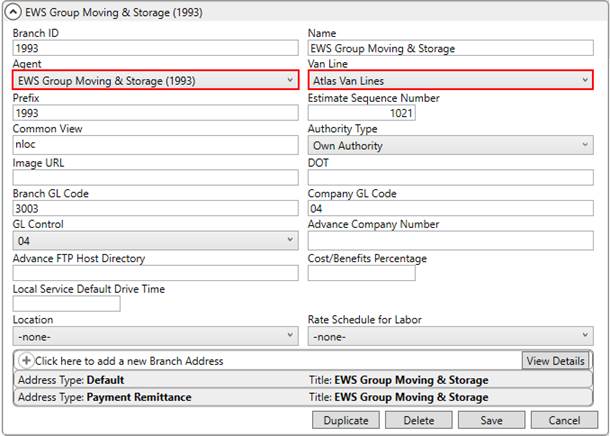 For the branch of the orders you wish to have access to the Atlas Integration, link their Branch Setup record to the Agent and Van Line that link to Atlas Van Lines.