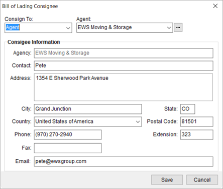 Data in this section automatically populates with data received from the selected agent, shipper, or vender.  You can manually update this data and changes made only affect this order (to save the information permanently, you must edit the setup information through MoversSuite Administration).