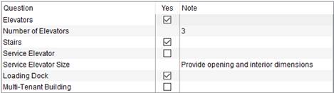 Enter a description for the constraint (up to 100 characters). The constraint appears as a question within the Building Constraints section of the Job Information tab. If prompting for a yes or no response for the constraint, then word the text of the question appropriately. In the example above, the question is “Elevators” and user can either check the box to indicate “yes” or leave it blank to include “no.” You can be as descriptive as needed, e.g., “Elevators on site?” You can also offer a subsequent prompt to the user to enter the number of elevators as a follow up question, e.g. “Number of Elevators.” In this case, you most likely would leave the Include The Yes No Flag unchecked and rely on the user to enter the count within the Note of the constraint. |