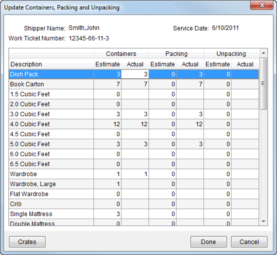 Ability to set estimated and actual counts for containers, packing and unpacking at the order as a whole and for individual services comprising the order