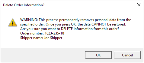 The Delete Order Information prompt appears when you press Delete Info from within Find Order for Redaction. This dialog prompts you to confirm the request for personal data removal from an order.