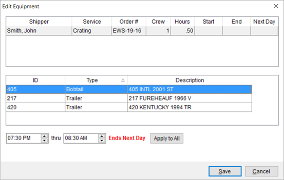 Update estimated times or quantities for equipment resources utilizing the Edit Equipment screen. This screen is available by right-clicking on a service within the Dispatch Center tab and selecting the Edit Equipment option.