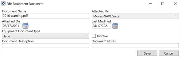 Administrators have the option to update the properties associated to a document. To edit document properties, go to Administration > Operations > Equipment > choose record > Documents tab and click on a document. This opens the Edit Equipment Document dialog allowing you to modify the Equipment Document Type, Document Description, or Document Notes.
