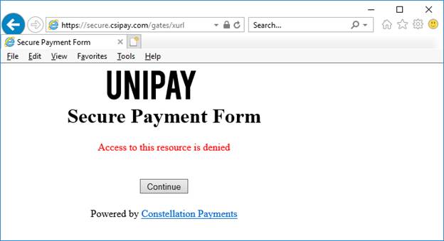 An error of “Access to this resource is denied” received when attempting to make a payment through the Secure Payment Form indicates that the processor does not recognize the merchant identifier for your company. Verify that the Merchant Account Code and other settings are correct within Electronic Merchant Setup.
