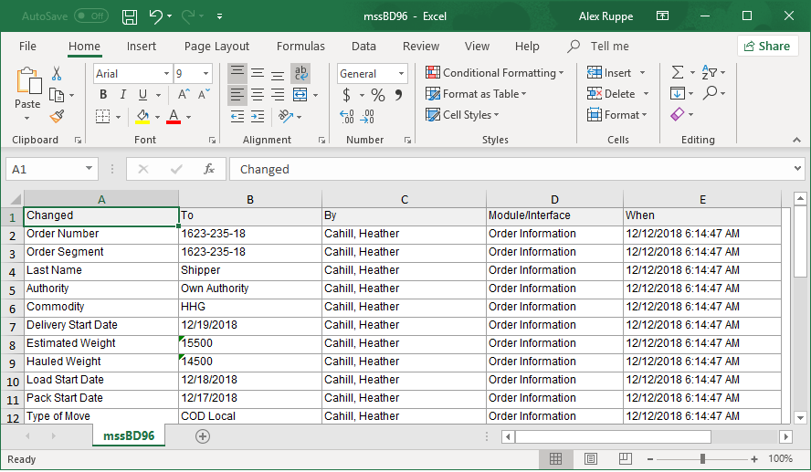Once you select either Excel or HTMLoption, the application automatically opens the file for viewing. The following is an example of data exported from the Order History screen utilizing the Excel option. This information can be reformatted, saved to a different file name, printed, etc.