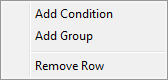 Add Condition Inserts a row based on the first data element in the list. Add Group Inserts a group based on a conditional operator such as “AND” and “OR.” Remove Row Removes the corresponding row without prompting the user for confirmation.