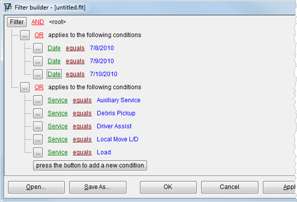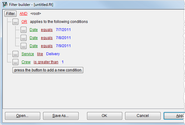 Apply (Alt+A) Use this function to apply the filter to data grid with still working within the Filter Builder. |