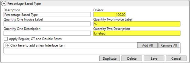 Establish a new Rate Type Setup record to support fuel surcharges. Set the Divisor to 100, based on the assumption that the amount is based on 100-weight pricing. Set the Quantity Two Invoice Label and Quantity Two Description accordingly.