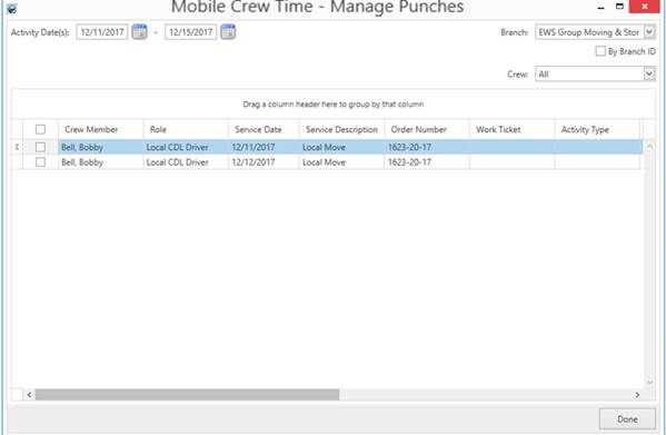 Manage Punches opens a Mobile Crew Time screen where you can see and update the punches entered by the on-site crew. After approval, the time punches can be associated to the revenue on an order done through the Enter Actuals feature in the Local Dispatch module and can then be imported to the Revenue Entry module for billing. Use the Mobile Crew Time grid to associate the time punches to an order.