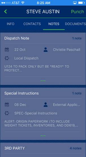 Crew leads can enter a note that is attached to the order. View MSCrew Add Note for details. The title features the shipper name along with the ability to Punch into an activity for the job.