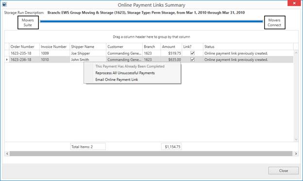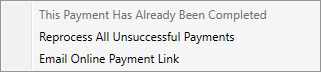 The Online Payment Links Summary screen appears automatically during a Recurring Billing Generation run when Online Payments are included. You can also evoke this screen through the View Online Payments within Recurring Billing Management for past billing runs. This screen allows you to view information on payments created during the billing run. It also provides reprocessing options through a right-click menu.